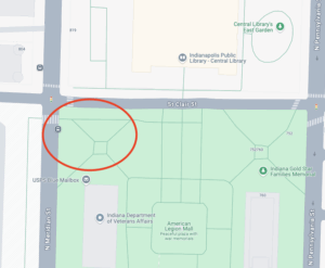 Indianapolis Food Not Bombs serves a hot prepared meal every Sunday from 4PM ~ 6PM at the corner of St. Clair & Meridian, right in front of the Central Indianapolis Public Library location and in the same park as the American Legion Mall. Usually we’ll be set up around the area circled in red!